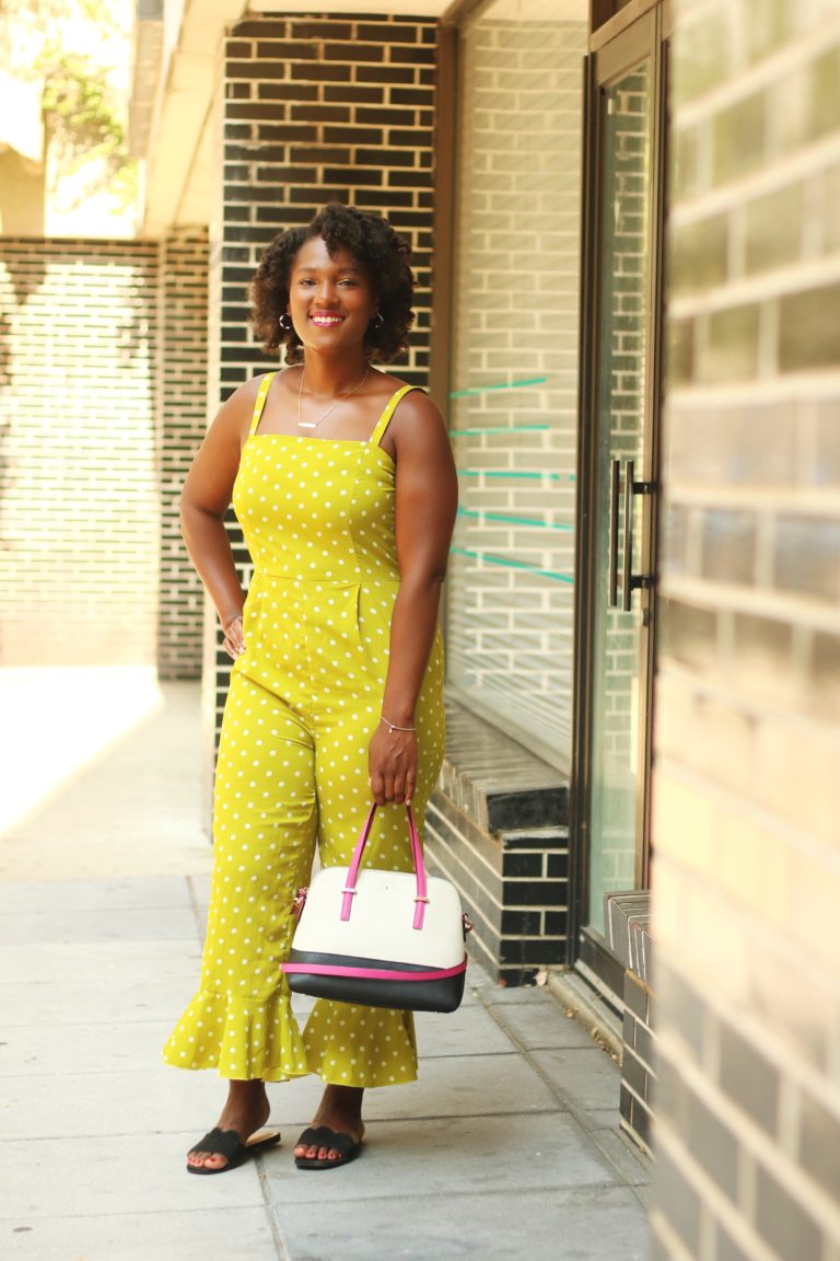 JOELLE | PHILADELPHIA, PA What she wore: Her favorite polka dot jumper, black sandals, and a leather hand-bang Style tip: Ladies, add some bold colors to a bold print! The yellow, polka dot jumper goes great with other vibrant colors…
